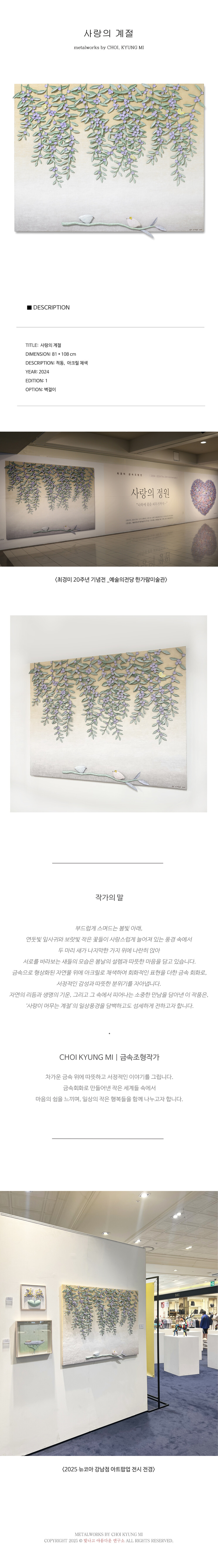 연둣빛 잎사귀와 보랏빛 작은 꽃들이 사랑스럽게 늘어져 있는 풍경_